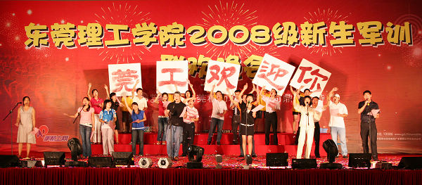 昨晚的体育馆成了一个欢乐的海洋,时长1个半小时的晚会,14个各样式的文艺节目粉墨登场,或通过诗歌朗诵表达新同学对大学生活的期盼、或借情景剧展现军人间的战友情深、或用手语宣扬新同学昂然向上的自信,更有军训团21位老师联袂演唱的、改编自《北京欢迎你》的《莞工欢迎你》,赢得了现场最热情的喝彩声。
