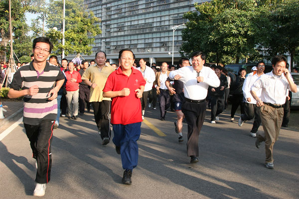 昨日,冬日里的松山湖校园运动氛围尤其浓厚,千余名教职工环校长跑一周,锻炼体魄、展示风采,以此来迎接即将到来的2009年。 校党委书记周致纳、副校长邹晓平等也兴致勃勃地加入到长跑的队伍中去,领跑在前。党委副书记王江水为长跑队伍鸣枪。 长跑队伍从行政楼停车场出发,经学术交流中心,过单身公寓,到二期饭堂,于艺术楼边上至综合教学楼,再右拐过经管楼,最终返回行政楼停车场,总长度约为2公里。