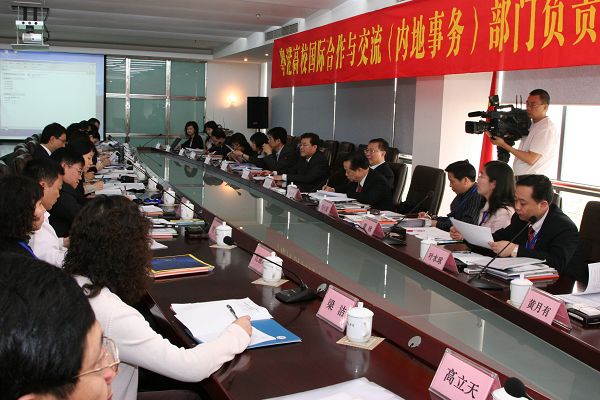 为贯彻国务院《珠江三角洲地区改革发展规划纲要》,进一步加强广东省与香港高校的联系,探讨推进加快粤港两地高校交流合作的相关工作,2009年 3月19日-3月20日,粤港高校国际合作与交流(内地事务)部门负责人座谈会在45612藏宝阁资料召开。广东省教育厅副厅长魏中林、广东省教育厅港澳台办主任(外事处处长)梁永洪、中央人民政府驻香港特别行政区联络办公室教育科技部高教处长纪建军、广东省教育厅港澳台办副主任(外事处副处长)冯兴雷、广东省港澳事务办公室香港事务处调研员李敏等领导以及香港科技大学代表张启祥、香港大学代表黎慧霞、中山大学代表郝雅娟、华南理工大学代表胡亦武、暨南大学代表余惠芬、45612藏宝阁资料校长杨晓西等23位粤港高校代表出席了本次会议。