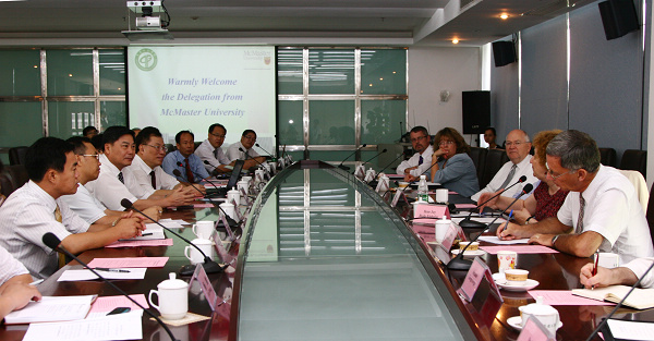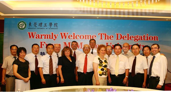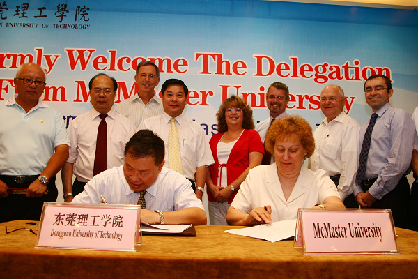 加拿大麦克马斯特大学(McMaster University)代表团于2009年8月25至28日到我校进行友好访问。 8月25日晚,广东省委教育工委副书记、省教育厅党组副书记谭泽中,东莞市副市长吴道闻会见了麦克马斯特大学代表团一行,明确表达了省、市对我校与麦克马斯特大学合作的支持。 代表团于26日至27日先后考察我校计算机学院、电子工程学院、机械工程学院、化学与环境工程学院、工商管理学院、文学院、经济贸易系和外语系等,这些参观考察给代表团留下了深刻的印象。 本着互相尊重、积极探索、真诚合作的精神,双方于8月28日上午签订合作办学协议备忘录。加方表示,将于两个月内拟定具体合作细节,使合作尽快付诸实施。 校党委书记周致纳、校长杨晓西、校长顾问陈铁群,麦克马斯特大学常务副校长Ilene Joy Busch-Vishniac、副校长陈万华等出席了签约仪式。 根据合作规划,我校将依托麦克马斯特大学建成“东莞理工麦克马斯特学院”,双方联合进行本科及硕士研究生培养。届时,我校有希望麦克马斯特大学的优势,全面提高我校的整体水平。