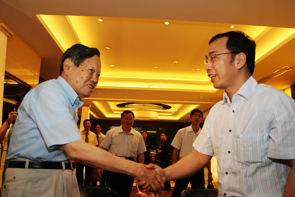 汇报座谈会上,杨振宁博士一行认真地观看了我校近一年来的发展概况的汇报片。观看的过程中,杨博士神情专注,脸上始终挂着慈祥的微笑,当看到我校以“良好”成绩通过教育部本科教学工作水平评估,硕士点申报工作取得突破,两位获得2008年度“杨振宁奖学金”同学的近况时,杨振宁更是不断点头表示赞许。随后,杨振宁博士还了解了2009年度“杨振宁奖学金”获奖集体的相关情况,并认真地在每一个集体的获奖证书上签上了自己的姓名。