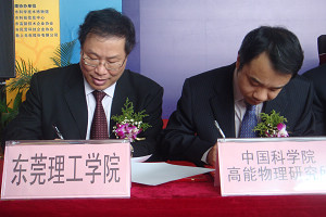 10月29日上午,在2009东莞国际科技合作周科技合作项目签约仪式上,杨晓西校长与中国科学院高能物理研究所王贻芳常务副所长签署了《45612藏宝阁资料与中国科学院高能物理研究所战略合作框架协议》。