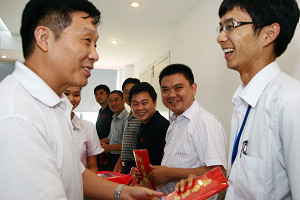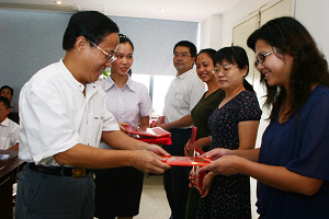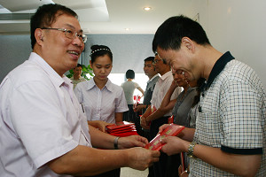 9月9日下午,学校召开教师节座谈会,对56位获得“2008—2009学年度教书(管理、服务)育人先进个人”称号的教职工进行了表彰。会议由党委副书记王江水主持。 学校党委副书记、校长杨晓西宣读了《关于表彰2008—2009学年度教书(管理、服务)育人先进个人的决定》,号召全校教职员工向获得表彰和奖励的同志学习,学习他们爱岗敬业、无私奉献、团结拼搏,开拓进取的精神和优良作风,为学校在新的平台上实现新的发展做出更大贡献。 学校领导周致纳、杨晓西、安少华、邹晓平、戴炳源分别为获奖教职工颁发了荣誉证书。