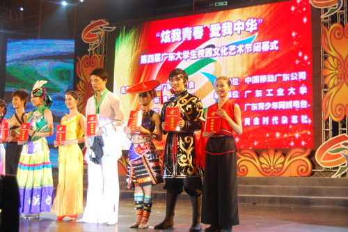 我校在此届大学生校园文化节中取得了丰硕的成果,同时荣获了“优秀组织奖”和“优秀宣传奖”。其中,舞蹈《壮族大歌》荣获“舞势界”广东大学生舞蹈大赛一等奖;DV作品《爱是坚持》、《路》和《今日莞工》分别荣获“我们的事”广东大学生DV大赛三等奖和优秀奖;动漫作品《千里之外》和《一半项羽》荣获“动漫星领域”广东大学生动漫大赛优秀奖。个人获奖分别有:叶翔宇同学和何锦华同学分别荣获广东大学生庆祝新中国成立60周年知识竞赛一等奖和三等奖;王恒同学荣获“魅力星声”广东大学生校园歌手大赛“三等奖”,黄语琴同学和朱晔荣获“古韵新声”广东大学生民族器乐大赛优秀奖,李杰同学荣获“靓声新主播”广东大学生主持人大赛“优秀奖”。
