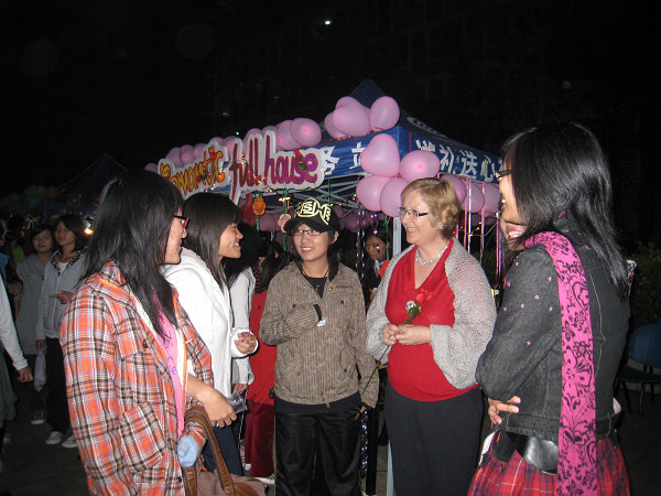 当晚,宿舍广场就一片欢腾。现场设置了圣诞节、万圣节、感恩节、情人节和巴西狂欢节5个外国节日风情摊位展示。同学们使出浑身解数,悉心布置自己的摊位,把一个个外国节日的文化特色展现得淋漓尽致。还有一位外教装扮成圣诞老人,向观众大派糖果、与观众合影、用英语讲述圣诞节的文化渊源。