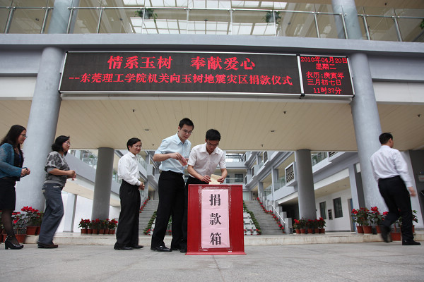 4月20日上午11:30分,学校机关党总支举行了向玉树地震灾区献爱心的捐款活动,学校党委副书记、校长杨晓西带头进行捐款,其他因公出差在外的学校领导和教职工也委托所在党支部的同事进行了捐款,不到半小时内,机关党总支共筹得善款人民币34010元。