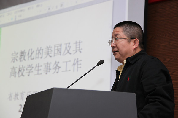 3月25日下午,广东省教育厅思政处处长袁本新博士应邀来我校,指导我校思想政治教育工作,并为我校思想政治教育工作队伍作了题为《宗教化的美国及其高校学生事务工作》的专题讲座。讲座由我校副校长邹晓平研究员主持。