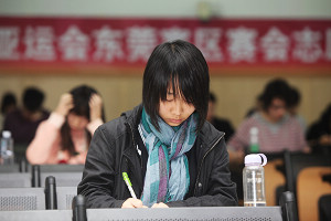 4月10日,广州亚运会东莞赛区赛会志愿者选拔测试分别在我校进行,全市共有1268名志愿者申请人竞争200个名额,其中有600多名的亚运会志愿者申请人在我校考场参加了测试(另一考场设在我校城市学院),除了我校报名参与的460多名学生外,还包括广东医学院、东莞职业技术学院以及部分镇(街)的申请人。 据悉,选拔测试分英语笔试和口语测试、心理及综合测试笔试和面试;此次选拔结果并不是最终结果,初步入围者还将参加培训和实践,最后由广州亚运会组委会决定录取人选。