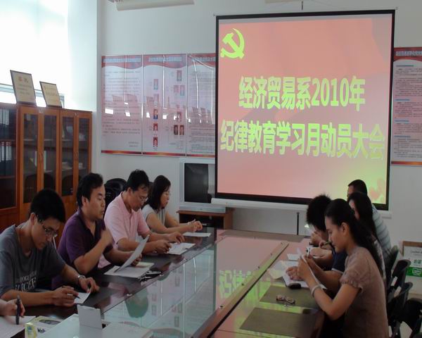 6月11日,经济贸易系党总支召开2010年纪律教育学习月活动动员大会。该系全体教工党员参加了会议。