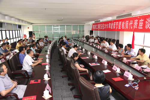 9月9日下午,我校召开庆祝2010年教师节暨教师代表座谈会。学校领导周致纳、杨晓西、王江水、黄碧莲、邹晓平、戴炳源,有关部门负责人以及教师代表共70多人参加了座谈会。 会上,校长杨晓西宣读了《关于表彰2009—2010学年度教书(管理、服务)育人先进个人的决定》,共有55名教师获得了表彰。 获奖教师代表、计算机学院曾金平在会上表达了对教师行业的热爱之情,表示将再接再厉,做好本职工作,尽最大努力为学校的发展贡献自己的一份力量。 校党委书记周致纳肯定了我校教职工为学校的发展所作出的贡献;希望广大教职工振奋精神,坚定信心,牢记使命,敢于担当,加强学习,不断提升,以学校良好的事业发展为平台,立足本职,积极创新,再立新功。