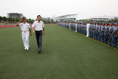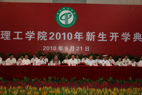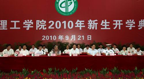 9月21日,我校在体育馆隆重举行2010级新生开学典礼。出席开学典礼的领导嘉宾有:中国科学院院士、我校双聘院士徐建中教授,海军沙角训练基地副司令员邓少申上校,我校领导周致纳、杨晓西、王江水、黄碧莲、安少华、邹晓平、戴炳源,学校机关职能部门和各院(系)主要负责人,军训团领导等。 开学典礼进行了军训总结,揭晓了军训期间各项评比结果,对获得乙等奖学金的8名同学进行了颁奖。 杨晓西校长在典礼上致辞,期望同学们要有端正的学习态度和勤奋的学习精神。 教师代表、化学与环境工程学院邵友元教授希望新生们做一个有理想的人,一个学有所长、专业优秀的人。他表示每一位老师都愿意分担同学们成长中的苦恼,分享同学们每一次进步和成功的喜悦,更盼望同学们能够本着“吾爱吾师,吾更爱真理” 的精神和老师们讨论、辩论、教学相长。 在校生代表、2007级体育系学生钟伟表示将与新生们一起传承互助互爱、刻苦学习、敢于实践、勇于创新的优良传统,恪守“学而知不足”的校训,共同迈向崭新而又丰富的人生旅程! 新生代表、2010级经济贸易系学生表示将用“调整适应”、“明确目标”、“严于律己”、“和谐成才”这四把钥匙开启大学生活的灿烂旅程。