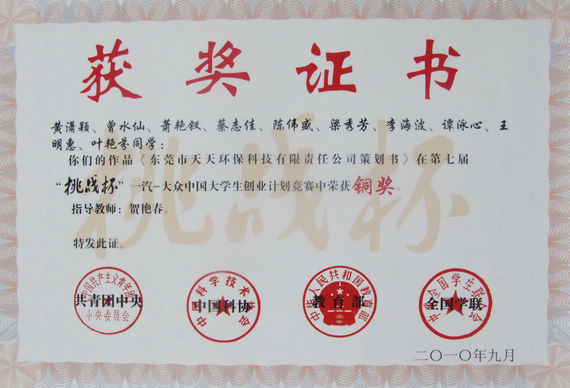 《东莞市天天环保科技有限责任公司策划书》由工商管理学院贺艳春博士指导,黄潇颖(计算机学院)、曾水仙(工商管理学院)、萧艳钗(工商管理学院)、蔡志佳(化学与环境工程学院)、陈伟盛(化学与环境工程学院)、梁秀芳(工商管理学院)、李海波(工商管理学院)、谭泳心(政法学院)、王明惠(工商管理学院)、叶艳芬(工商管理学院)等10位同学参与,重点关注废气处理产品,对我校化学与环境工程学院范洪波教授、吕斯濠博士开发的具有知识产权的核心产品——低温等离子体协同贵金属工业空气净化器进行创业策划,意义深远,定位准确,创业计划翔实,获得专家的广泛好评。