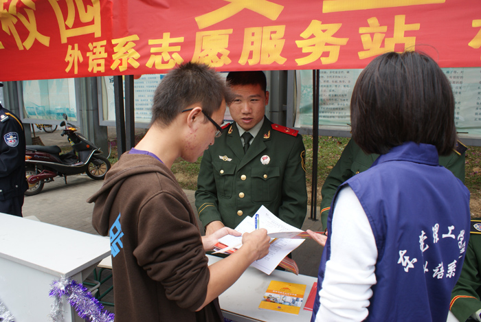 11月22日,外语系志愿服务站联合松山湖消防大队在一期饭堂旁举行了以“消防在校园,安全在我心”的消防安全知识宣传活动。