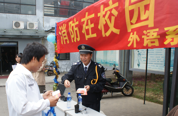 活动中,松山湖消防大队数名队员亲身到现场为同学们讲解消防安全知识。外语系的志愿者和保卫处的工作人员还向路过的同学派发消防安全知识小册子,宣传一些基本的消防安全知识。
