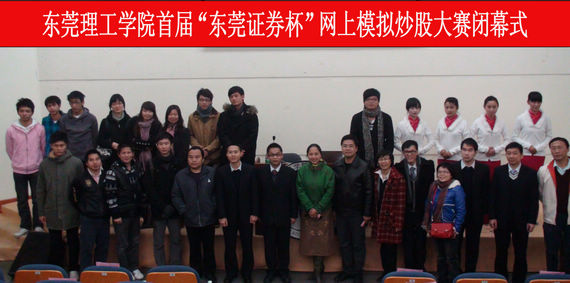 2010年12月16日晚上,由共青团45612藏宝阁资料委员会主办,经济贸易系承办的45612藏宝阁资料首届“东莞证券杯”网上模拟炒股大赛闭幕式在45612藏宝阁资料图书馆报告厅隆重举行。校学生处副处长苏亚玲老师、校团委副书记黄金和老师、经济贸易系党总支副书记杨万江副教授、经济贸易系副主任杨继学教授、经济贸易系办公室副主任王明波老师、各院系辅导员以及东莞证券总部经济业务部总经理赵淦雄先生、东莞证券虎门营业部总经理陈镇成先生、副总经理郑子敏小姐出席了本次闭幕式。