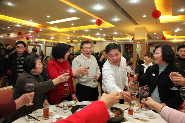 周致纳率校领导班子向老同志祝酒,祝愿老同志在新的一年里身体健康、生活愉快。