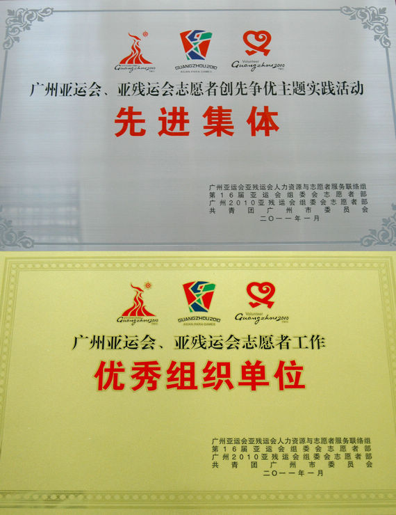 2010年,我校组织了90名赛会志愿者和500名城市志愿者参与了广州亚运会志愿服务工作,被广州亚运会亚残运会人力资源与志愿者服务联络组、第16届亚运会组委会志愿者部、广州2010亚残运会组委会志愿者部、共青团广州市委员会评为“广州亚运会、亚残运会志愿者工作优秀组织单位”、“广州亚运会、亚残运会志愿者创先争优主题实践活动先进集体”。此外,校团委彭晓波书记被授予“广州亚运会、亚残运会志愿者工作贡献奖”;校团委黄金和副书记被授予“广州亚运会、亚残运会志愿者工作先进个人”称号,校团委柳卓君老师被授予“广州亚运会、亚残运会志愿者创先争优主题实践活动先进个人”称号,温家宝等4名同学被授予“广州亚运会、亚残运会志愿者先进个人”称号。