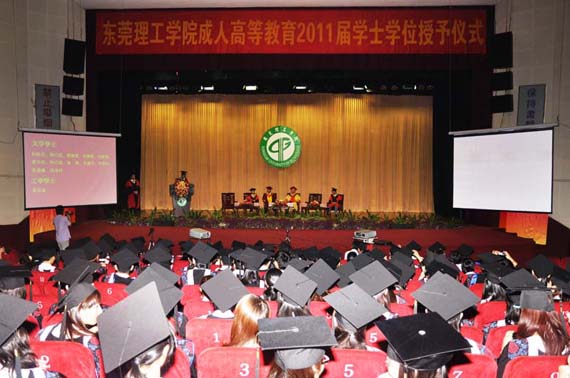 7月3日,我校成人高等教育2011届学士学位授予仪式在莞城校区大礼堂举行。学校党委书记周致纳、校长杨晓西、副校长邹晓平,成教学院负责人等与获得学士学位的毕业生及其部分学生家属参加了仪式。
