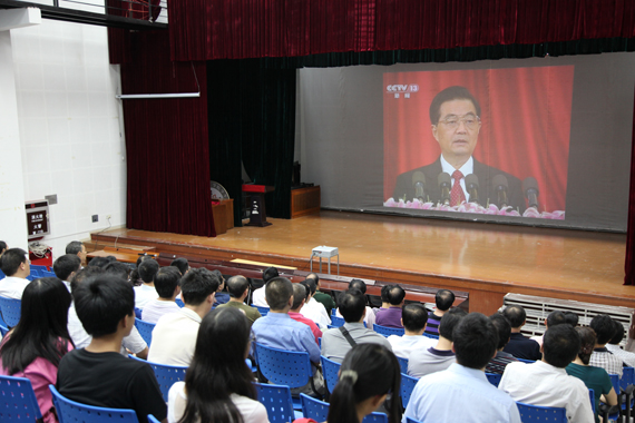 7月1日,庆祝中国共产党成立90周年大会在北京人民大会堂隆重举行。中共中央总书记胡锦涛在大会上发表重要讲话。我校中层以上党员干部和学生党员代表在学生活动中心小剧场集中收看了大会的现场直播。