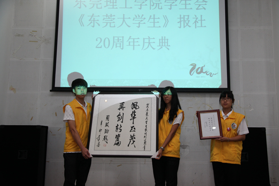 校党委书记周致纳、校长杨晓西分别为《东莞大学生》报创刊20周年题词