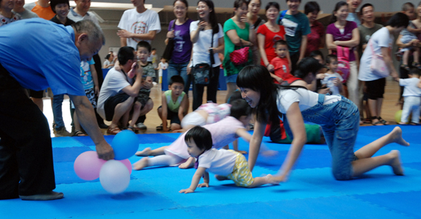 游戏内容有寻声认宝宝、宝宝摸手找爸爸妈妈、猪八戒背宝宝接力比赛、三人四足比赛、宝宝乐爬行比赛、剪羊毛、网鱼游戏和百人拔河比赛。活动内容丰富多彩,受到小朋友和家长的热烈欢迎。(妇委会/文 肖毅/图)