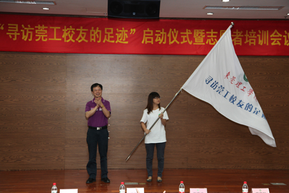 会上,李忠红为志愿者授旗并发表了热情洋溢的讲话,他指出在母校建校20周年之际,校友办组织开展“寻访莞工校友的足迹”的活动,特别有意义。李忠红勉励志愿者们努力开展好这次寻访活动,给广大校友带去党和政府对莞工的关心和支持的信息;带去母校的祝福和问候;带去母校近年发展的良好情况。同时,带回广大校友的信息和资料;带回校友对母校发展的意见和建议;带回校友的奋斗历程与人生体验。