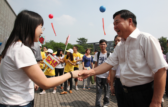 校党委书记周致纳与新生握手,欢迎他们成为莞工人。 张友炳/摄