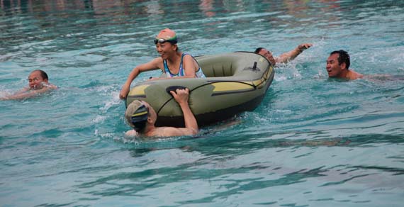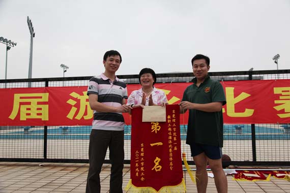 10月8日,校体育中心游泳池热闹非凡,我校第一届教职工游泳比赛在此举行。这次游泳比赛竞技项目与趣味项目相结合,共设有50米×10人自游泳混合接力、水中取宝、齐心协力接力比赛、水中拔河四个项目,各代表队的名次由四个项目的得分数相加排定。 最终,后勤集团代表队和教辅代表队并列冠军;外语系代表队和计算机学院代表队分别获得第三名和第四名。