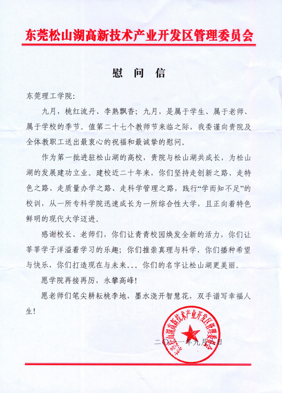 松山湖管委会向学校送来教师节祝福
