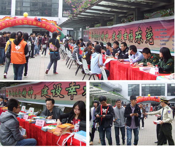 12月5日,我校政法学院、保卫处联合松山湖园区相关部门在学校一期饭堂前举行主题为“遵纪守法和为贵,与法同行天地宽”的法制和校园安全宣传活动。这是我校响应2011年“12.4”全国法制宣传日开展的宣传活动,也是我校加强校园安全稳定工作的系列活动之一。