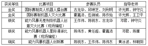 我校在国际赛制机器人灭火赛项目中,队员们以熟练的编程与操作技术以及高效的现场应变能力,出色的完成了三轮比赛,获得金奖,成功取得明年四月初在美国康涅狄格州举办的国际机器人灭火大赛入场券;国际赛制类人机器人擂台赛项目中,队员们在赛场上顽强拼搏、斗智斗勇,最终也获得金奖,同时获得了参加2012国际类人擂台赛的入场资格; 机器人星际漫游比赛(现场编程)和无差别级机器人创意灭火比赛(现场编程)分别在比赛中获得银奖;机器人创新比赛在比赛中获得了铜奖。
