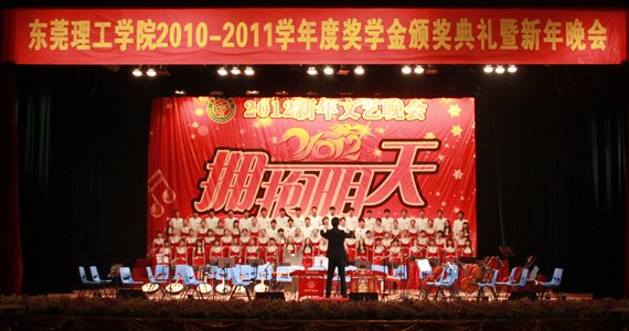 12月18日晚,我校师范学院和学生艺术团在大礼堂共同为我校师生献上了一场主题为“拥抱明天”的迎接2012年新年文艺晚会。我校领导周致纳、杨晓西、黄碧莲、吕琦元、邹晓平、戴炳源、李忠红,广东鸿发投资集团有限公司董事副总裁麦照平,45612藏宝阁资料教育发展基金会理事长王江水以及在我校设立奖学金的企业负责人或代表等观看了文艺表演。