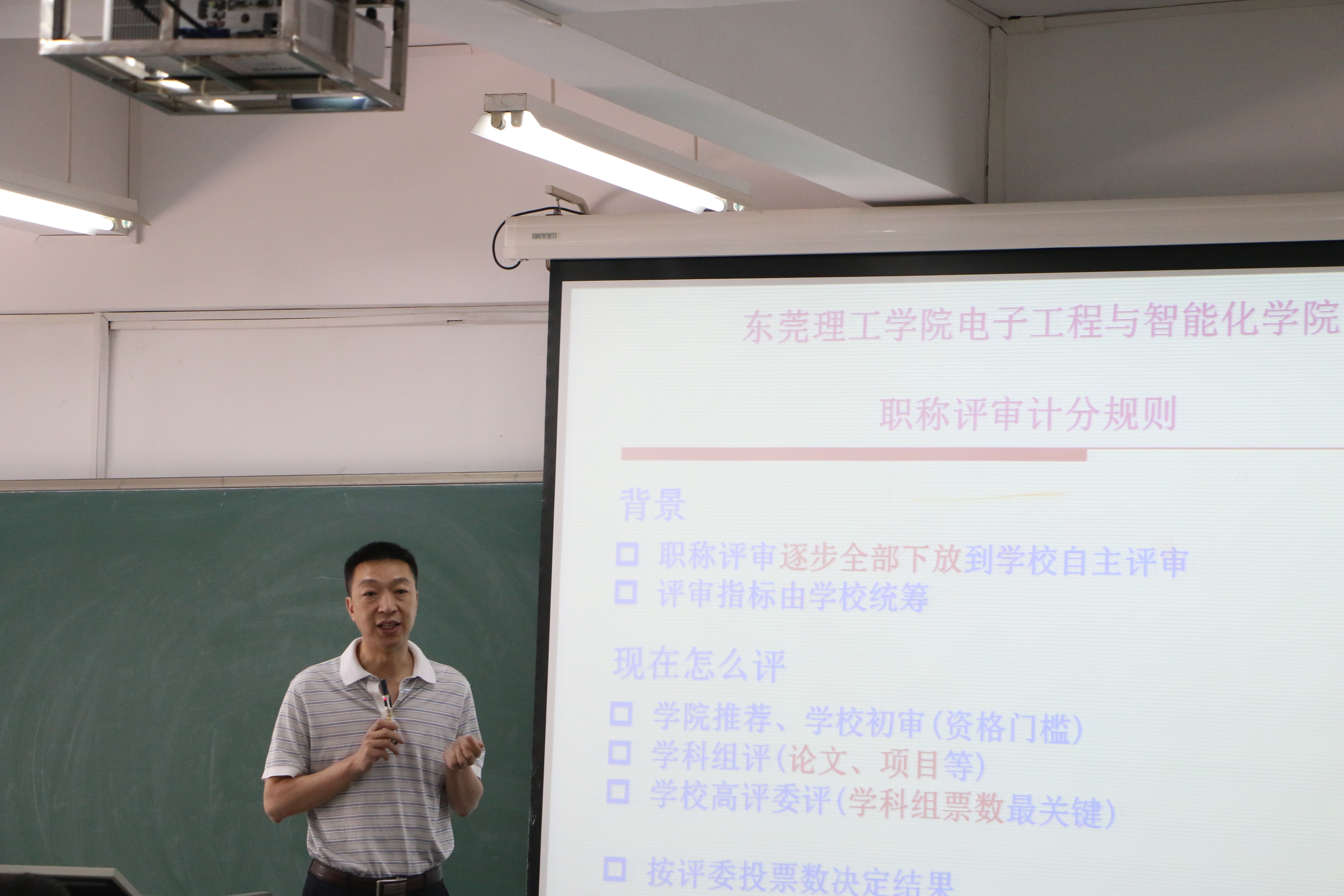 5月11日,电子工程与智能化学院举行全体教职工大会,院长胡耀华解读电智学院教学业绩改革的详细内容。