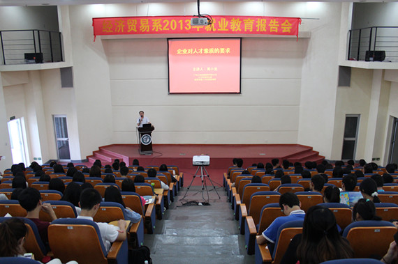 为了加强对大学生的就业教育,帮助学生树立正确的就业观念,经济贸易系于11月7日在图书馆报告厅举办了“经济贸易系2013年就业教育报告会”,特别邀请了广东汇富控股集团有限公司人力资源部总监、国家高级人力资源管理师周小龙为全系学生作了一场题为“企业对人才素质的要求”的就业教育报告会。