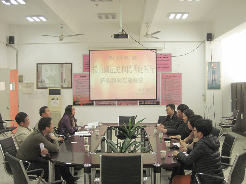 2月26日,东莞市第一人民法院松山湖法庭庭长胡志炜和民四庭副庭长柯小玲等一行5人来到我校,与政法学院负责人及法学专业骨干教师一起就双方资源共享、院校共建进行了交流。 法院方面希望政法学院法学专业教师能在重大课题调研、案例引证研究及专业专家陪审方面提供理论和专业指导;而政法学院希望法院方面在学生实习、法官参与实务教学方面予以配合和支持;法官们还就课程设置、实习改革提出了建议。双方达成共识,将定期举行松湖法学论坛,互相在学生培养和庭审改革方面进行合作,探索院校合作的新途径。