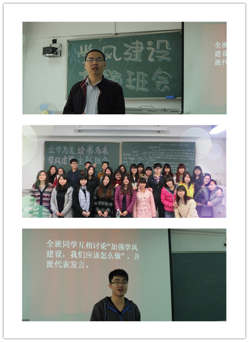 近日,工商管理学院各班级根据学风建设系列活动的总体部署,加大学风建设的影响力,切实提高学风建设的实效性,先后召开“立学为先 读书为本”学风建设主题班会。