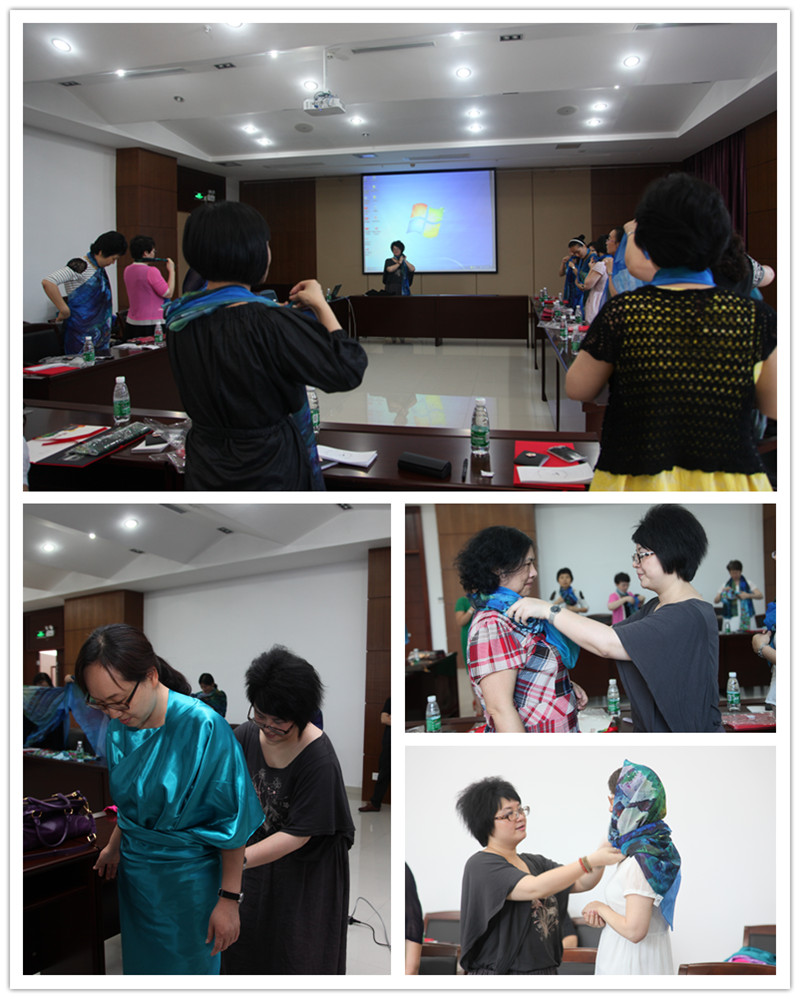 5月22日,“吴沫艺术策划机构”负责人吴沫以丝巾为话题,与我校妇女委员会成员分享了自己对“时尚与艺术”的理解,并现场教授女教工们如何打扮自己,增加女性魅力。 在简短介绍了丝巾的来历和功能后,吴沫请现场的女教工做模特,展示了艺术创意的魅力。一条丝巾经过吴沫的巧手,变化出了不同的花式造型;一块不起眼的布料,在吴沫的指间化腐朽为神奇,变成了一件件款式各异、时尚典雅的晚礼服。大家表示,这样的讲座有助于提高审美能力,使自己的风度举止变得更优雅。
