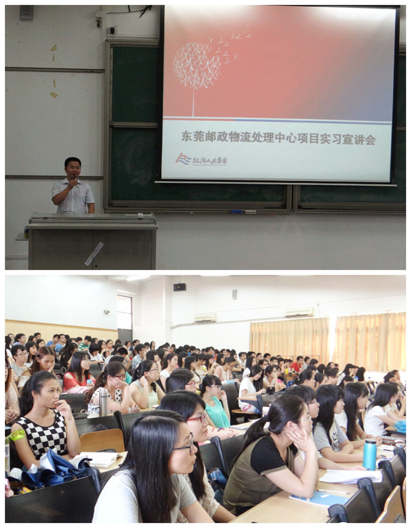 6月4日,工商管理学院举办红海人力集团项目实习宣讲会,主要内容是为需要实习的同学推介东莞邮政物流处理中心项目实习的机会。红海人力集团东莞分公司经理张金华、李庚红和工商管理学院副院长蔡传里博士、人力资源教研室专业教师及学院200余名学生参加宣讲会。