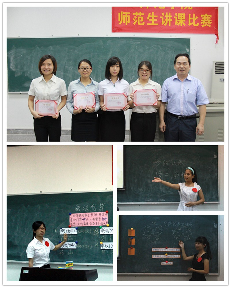 为进一步增强师范生的实践应用能力和创新能力,彰显师范特色,强化学生教学技能,6月11日,师范学院在文科楼举行2014师范学院师范生讲课比赛。由师范学院吴东涛老师和2011级小学教育文、理科班各选三名代表担当比赛的评委。