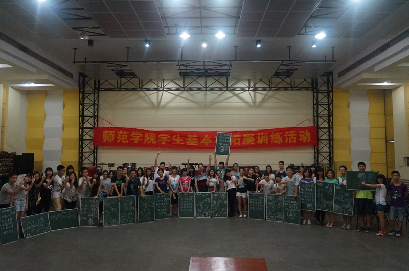 本次拓展活动分为两类,第一类为专业类,包括粉笔字、简笔画、绕口令、编故事、情景模拟(课本剧);第二类为拓展类,包括游戏“你争我赶”、“画画接龙”。活动以同学们的随机分组正式宣告开始。在小组孵化展示中,各小组的同学绞尽脑汁、出谋献策,共同设计出有创意的队名、口号、队歌、队徽等。随后,多种多样的拓展活动在同学们积极热情的参与下一一展开,为了增强竞争性、体现公平性和提高活动效率,还安排了评委对各组进行评分。粉笔字、简笔画等,通过在小黑板上完成,最后向大家展示;而绕口令、编故事、情景模拟等则通过口述和表演等形式开展,其中难度最大和最精彩的莫过于情景模拟,同学们利用一些简单的道具和充满趣味的表演,将故事的情景展现在大家面前,喝彩声、掌声、欢笑声阵阵响起,也将活动气氛推向高潮。在游戏环节,同学们更是玩得不亦乐乎,激烈的竞争让人紧张,蹩脚的画技使人爆笑。