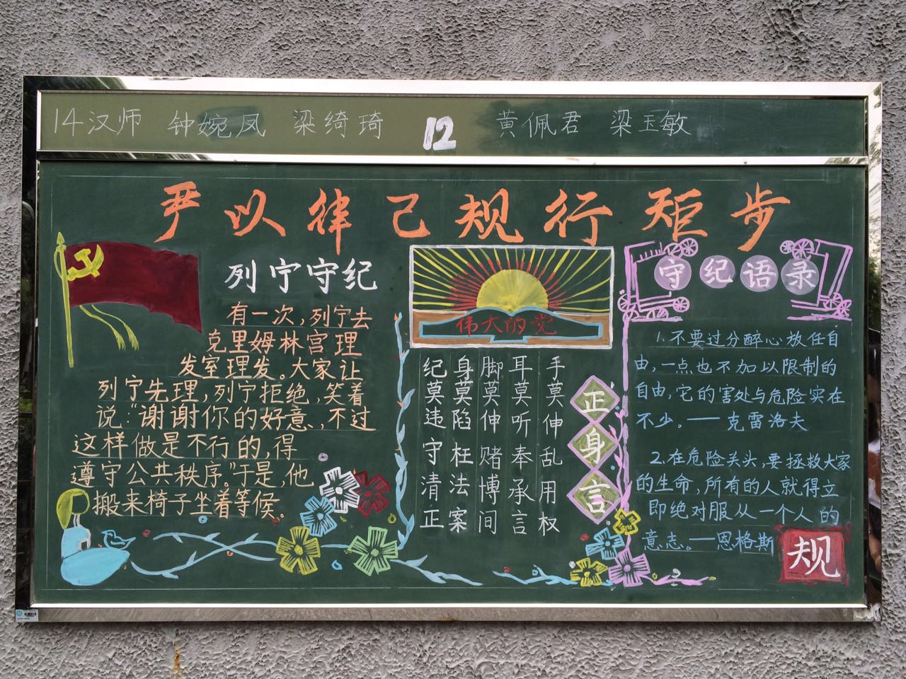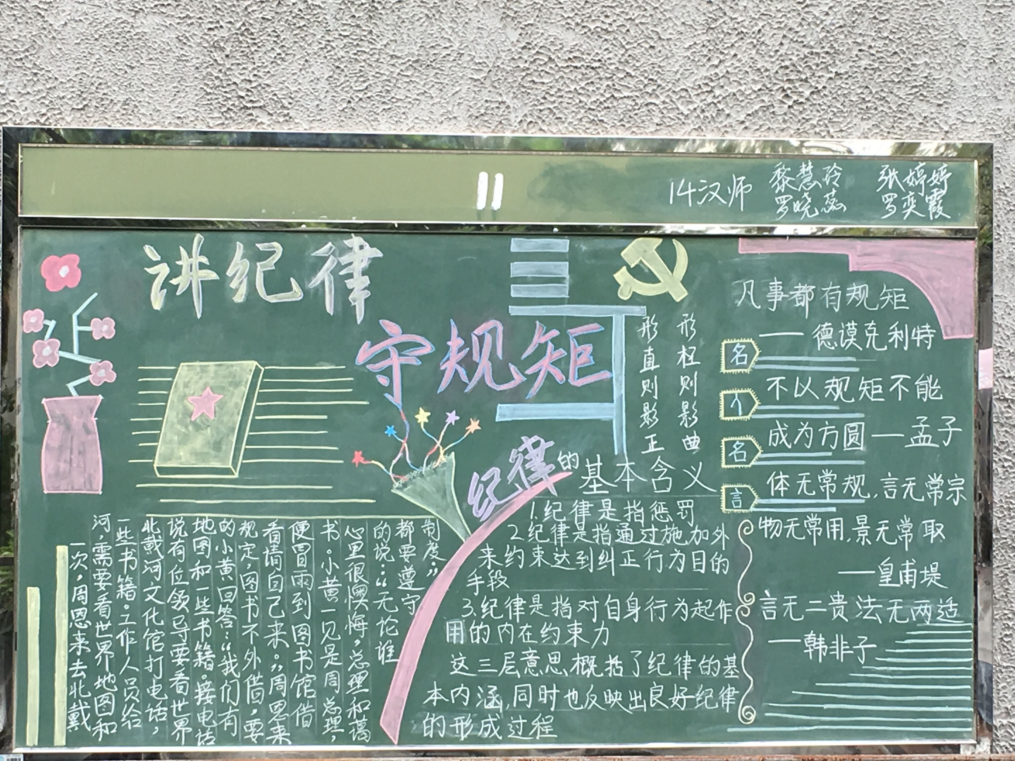 为了进一步组织好2016年纪律教育学习月的活动,教育学院(师范学院)结合专业特点,在9月中旬,举办了主题为“讲规矩,守纪律”的黑板报比赛。 全院学生党员及入党积极分子参加了比赛。同学们积极响应,共收到了24幅板报作品,经过老师的评定,选出6幅作品作为优秀板报作品进行了表彰。