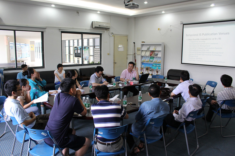罗欣教授首先介绍了电子商务、信息系统安全管理、跨文化信息技术管理等学科专业国际知名刊物发文的主流方向,随后从主编的角度讲述如何选择期刊、如何准备论文、如何翻译论文、如何对待期刊反馈的投稿信息等发表国际高质量期刊论文的经验。他鼓励教师们多参与国际会议,大胆与国际期刊的编辑、国内外知名高校的研究者进行交流甚至是合作,选好主题大胆撰写英文论文投向国际高质量期刊,并根据审稿人和编辑的反馈意见不断修改论文,从而也锻炼提高自己的研究、写作水平。随后教师们在发表国际高质量期刊问题展开了进一步讨论,令在场教师受益匪浅。
