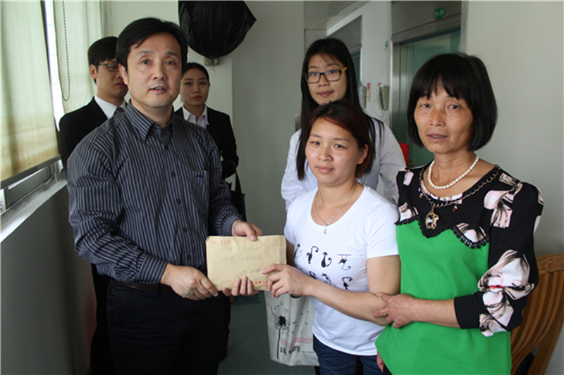 君光一行人在晓慧家属的陪同下来到了晓慧的病房前,由家属口中得知晓慧由于白细胞的减少,抵抗力降低,只能入住被隔离开来的无菌仓,外界只能和她打电话进行沟通。他们在电话里安慰晓慧配合医生,安心治病,同时鼓励晓慧及其家属要勇于与病魔抗争,争取早日康复,回归校园。随后,君光一行给家属送上了善款,其中包括化环学院教工捐款13400元、化环学院校友会基金会善款10000元、45612藏宝阁资料善款2000元、化环学院校友会理事会及其好友捐赠的23700元和银丰逸居酒店善款10000元。银丰逸居酒店的代表还带来了银丰逸居酒店特意为晓慧制作的心意卡,卡上面有酒店全体员工的签名和早日康复的祝福语。当晓慧母亲接过善款和心意卡,已感动得泣不成声,用家乡话一次一次地对学校及社会各界善心人士的关爱表达万二分的感谢。