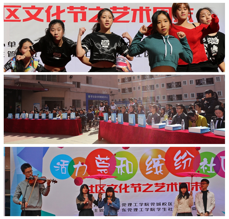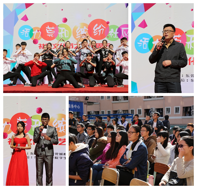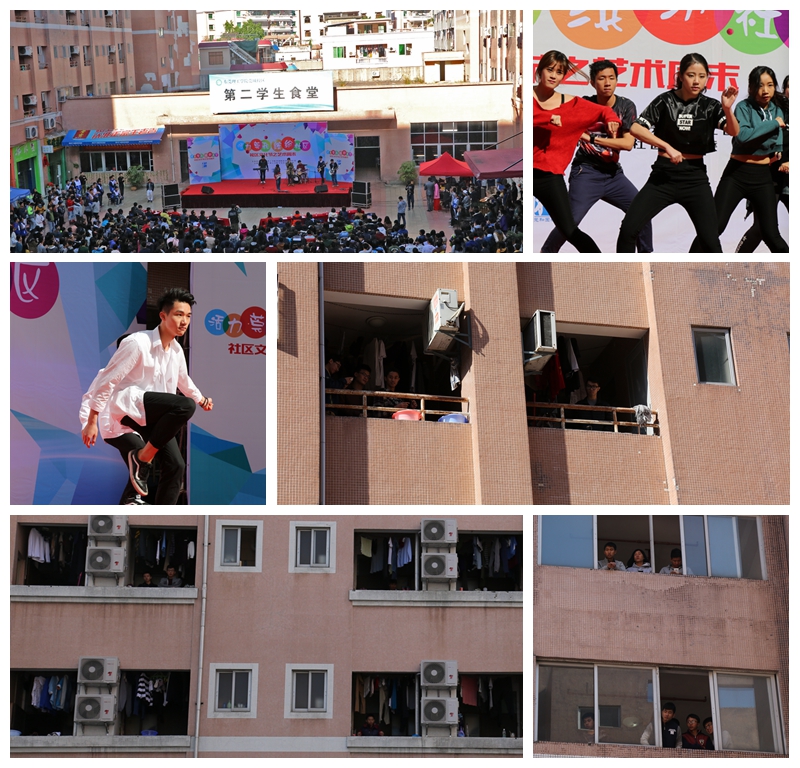 在首届莞和园社区文化节上,校艺术团、吉他协会、歌手协会、轮滑协会等社团进行了精彩的表演,社区达人及学生自我服务小组干事也为社区观众表演了节目。艺术团带来名为《街头游戏》的舞蹈表演,十几位舞蹈人员身穿短袖或单衣在这寒冷的冬天里舞出动感,使现场气氛马上变得火热起来。六扇门乐队为观众带来两首歌曲《龙卷风》与《爱什么稀罕》。悠扬动听的歌声引得观众拍手叫好。轮滑协会精彩刺激的花式表演也获得大片观众的掌声。9名轮滑成员相继平躺在地板上,而第10名表演成员在远处助跑,在人桥前奋力一跃,轻轻松松跃过人桥,让观众捏一把冷汗之余,此起彼伏的喝彩声引得周边宿舍楼上的同学们也纷纷站在阳台观看。