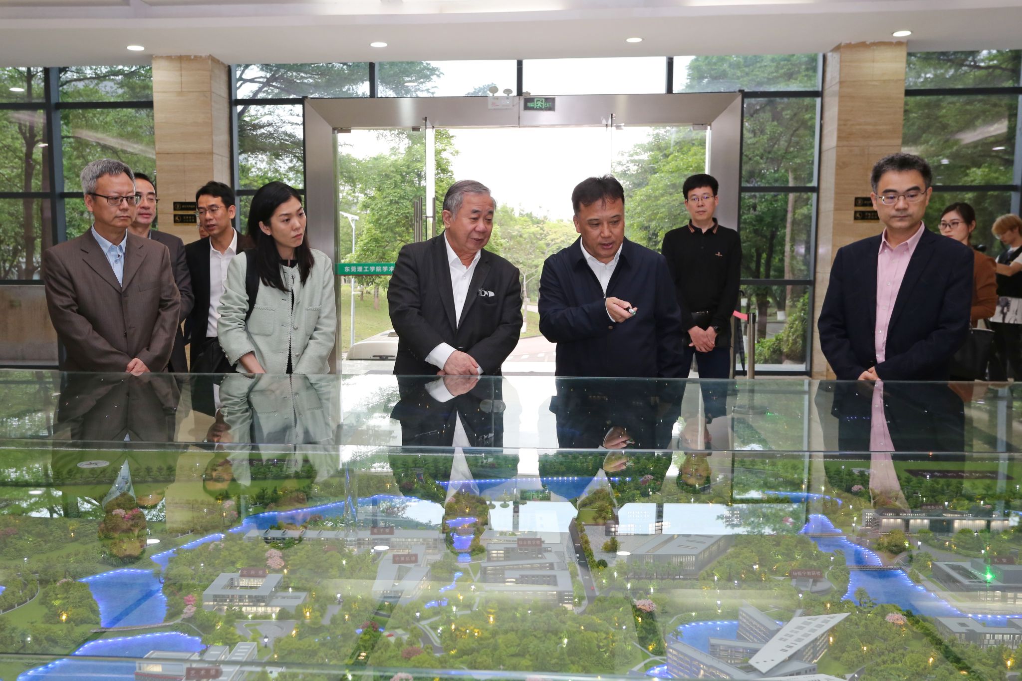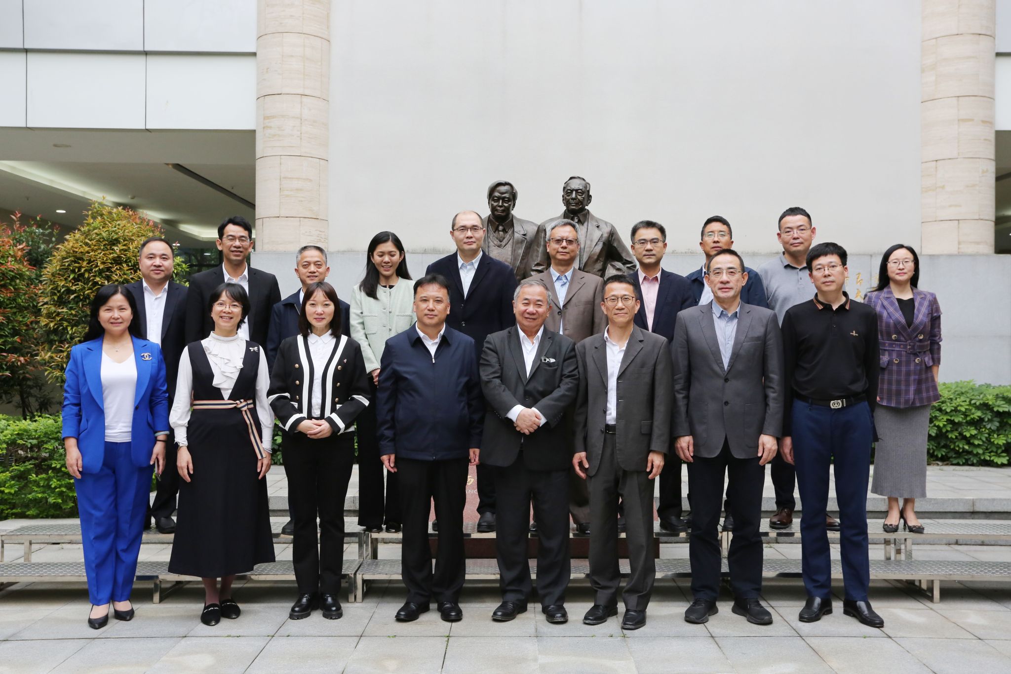 马宏伟在学术会议中心沙盘处为梅彦昌一行展示了学校当前规划建设情况。随后,双方在杨振宁像前合影留念并开展座谈交流。