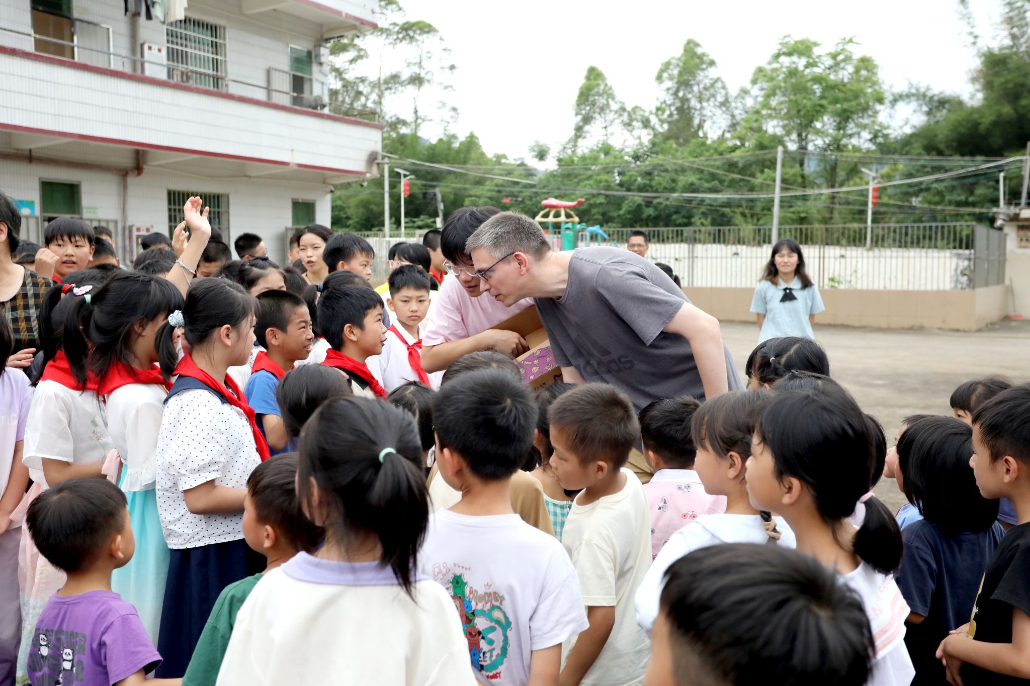 在新丰县来石小学、新村小学,小朋友们正在举行丰富多彩的儿童节活动。小分队一行到校看望在此支教的文传学子,了解其生活、工作情况及目前存在困难,并勉励同学们坚守岗位、脚踏实地,做好支教工作。为了丰富小学文体设施,小分队还为小朋友带来了一批儿童读物绘本、体育用品。文传学院外籍教师Alan与同学们进行了现场教学互动,小分队代表积极参与学校篮球赛,与小朋友们共庆儿童节。