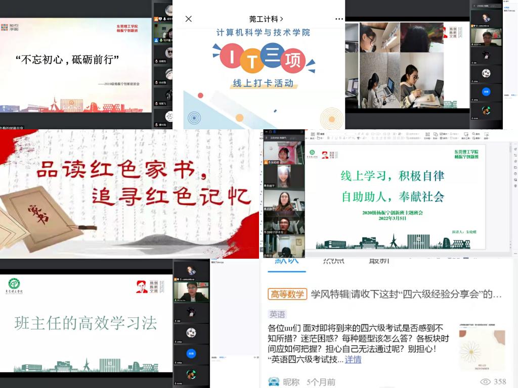 为帮助同学们尽快回归状态、适应新学期生活,保持积极健康的心理状态,各二级学院开展了主题班会、线上打卡等活动。学生社区知行学院开展“不忘初心,踔厉奋发”主题班会,向同学们分享了居家学习相关注意事项,引导同学们合理安排日常生活。计算机科学与技术学院开展“IT三项”线上打卡和“春悸”三行情书活动,丰富同学们日常生活,促进心理健康发展。生态环境与建筑工程学院举办21天线上打卡活动,帮助同学们提高自律能力,规律作息。法律与社会工作学院(知识产权学院)进行“引领”“引导”“引扶”三引线上学风建设,开展如学习笔记比拼会、读书会等有特色、分层次的学风建设活动。机械工程学院推出“青匠辅学小程序”,辅助同学们更好进行线上学习。教育学院(师范学院)举办手抄报比赛、健身视频比赛,绘写风雨同舟的抗疫决心,展示强身健体的防疫意识。