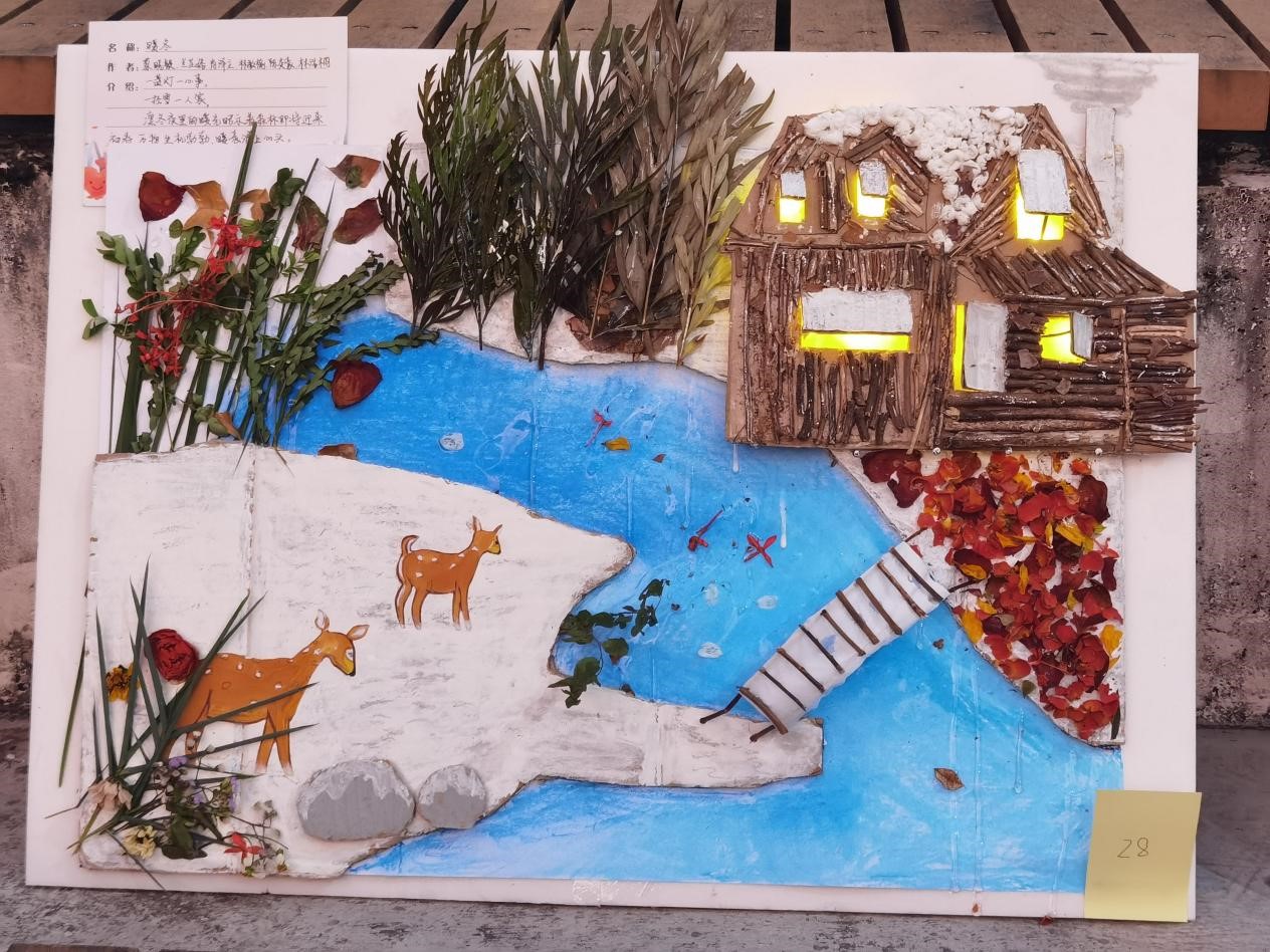 参与同学用自备的枯叶、干花以及现场提供的卡纸、胶水、剪刀等物品进行创作。同学们想象力丰富,动手能力强,利用花草落叶表达自己独特想法,制作了具有个人特色、生动且有意义的优秀作品。创作结束后,大家将作品摆放至展示区,供互相参观与交流。同学们在与同伴的互动交谈中感悟自然魅力,体悟创作乐趣。