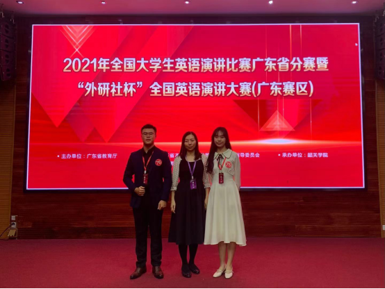 11月6日,2021年全国大学生英语演讲比赛广东省分赛、“外研社杯”全国英语演讲、写作、阅读大赛(广东赛区)在韶关学院举办,来自全省66所高校600余名选手同台竞技。我校文传学院卓越教研室主任刘瑾老师、江倩虹博士带队参赛。