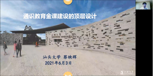 6月3日,学校邀请了汕头大学人事处处长、淑德书院院长蔡映辉作《通识教育金课建设的顶层设计》的讲座,全校三百余位教师在线收看。蔡映辉处长为老师们分析了通识教育课程“水课”的问题根源,并以汕头大学人才培养目标体系为案例讲解了通识教育金课建设理念,介绍了汕头大学通识教育金课建设的顶层设计和评估指标体系。讲座中,我校教师根据通识教育实际教学及改革教学过程中遇到的问题与主讲人深入讨论,学习了汕头大学通识教育课程建设的优秀经验。